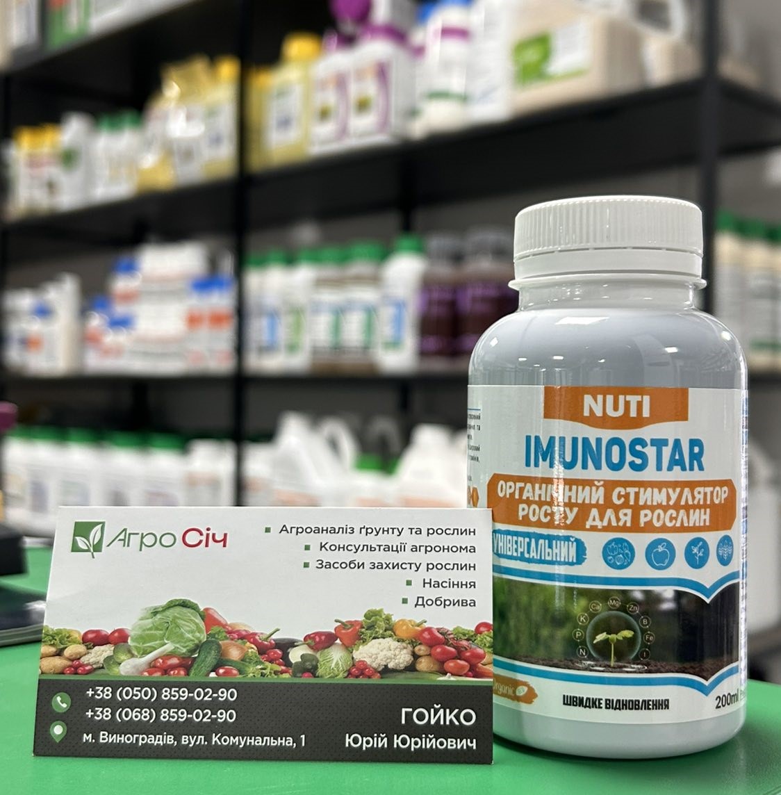 Imunostar — рідкий екстракт морських водоростей, створений за оригінальною технологією екстрагування та за принципами синергії хімічних елементів. Препарат Імуностар містить органічні сполуки та широкий спектр біологічно-активних речовин: вітамінів, кислот, фітогормонів тощо. Сумісний з більшістю добрив та пестицидів. Не є токсичним, небезпечним та горючим.