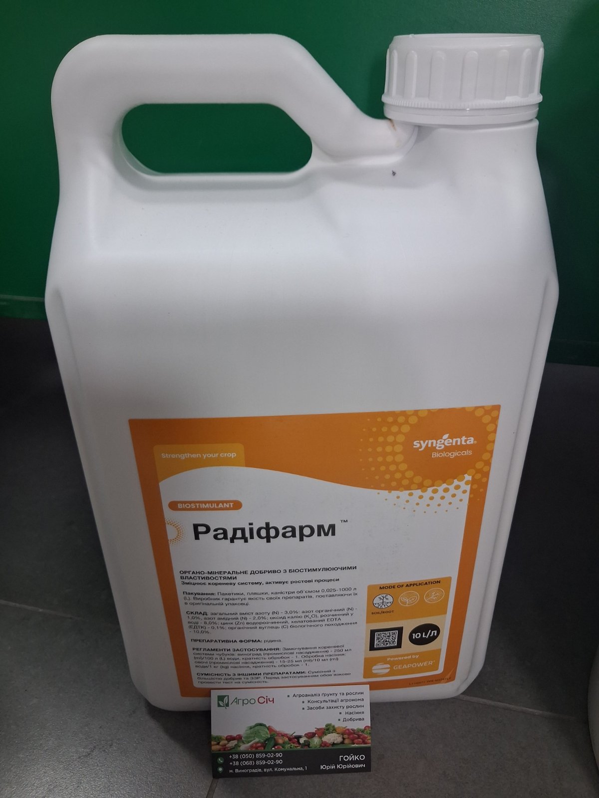 Укорінювач Радифарм 1л – один з кращих укоренителей або стимуляторів росту кореневої системи, корнеобразователь, спеціальний комплекс, що містить полісахариди, стероїди глюкозидів, амінокислоти і бетаїн, збагачений вітамінами і мікроелементами, розроблений для розвитку бічних і додаткових коренів (вторинна коренева система), забезпечуючи рівномірний розвиток всієї кореневої системи рослини.