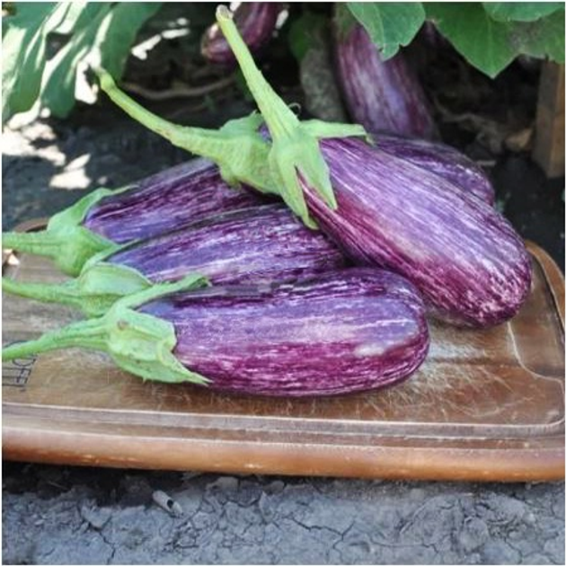 - Овальної форми червоно-фіолетові з білими смугами гладкі з блискучою поверхнею однорідні за розміром плоди масою 300-350 г (діаметр 12-14 см, довжина 16-18 см) мають ніжну, щільну м'якоть приємного смаку з невеликою кількістю насіння.